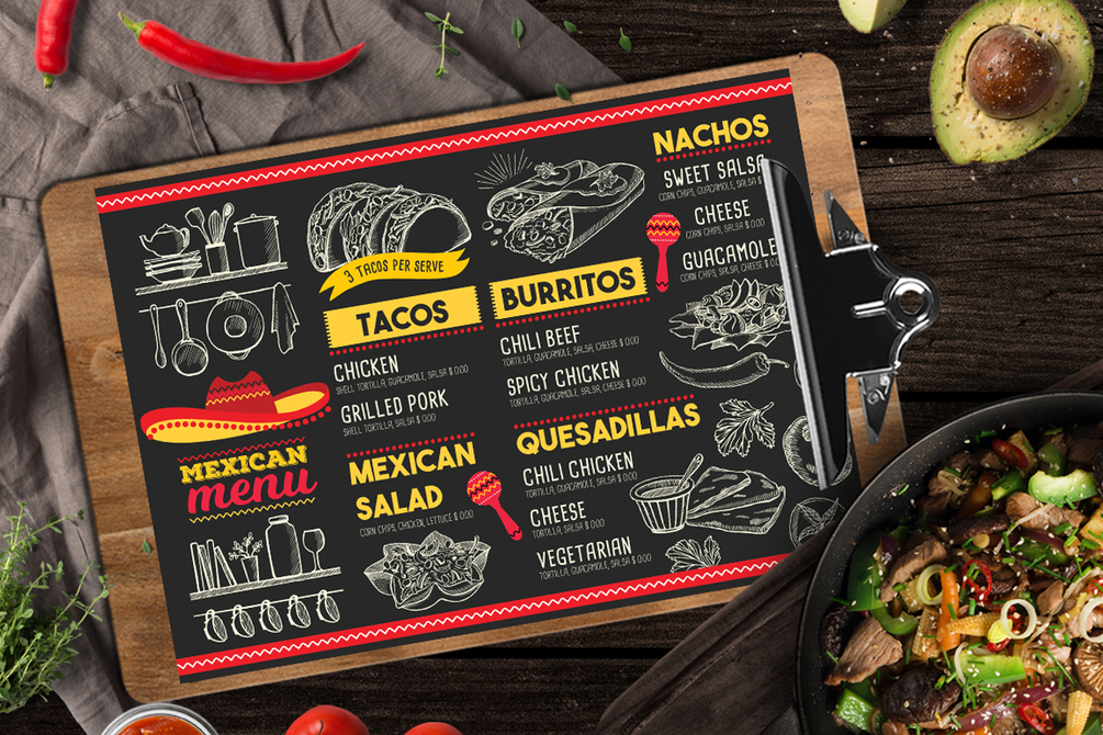 Mexican food menu template. Creative mexican food menu template for your restaurant business with graphic food illustrations - tacos, burritos, nachos.