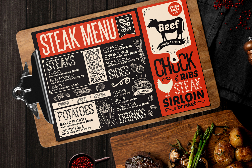 Steak Food Menu Restaurant Template. Creative steak menu template for your restaurant business with graphic illustrations.