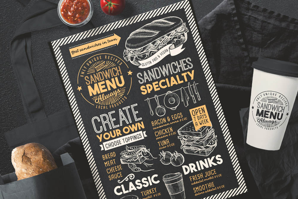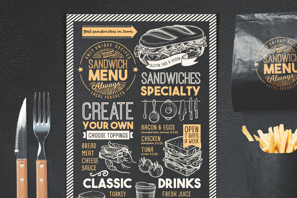 Sandwich food menu in blackboard style. Fast-food design template with hand drawn food illustrations - panini, sandwich, coffee.